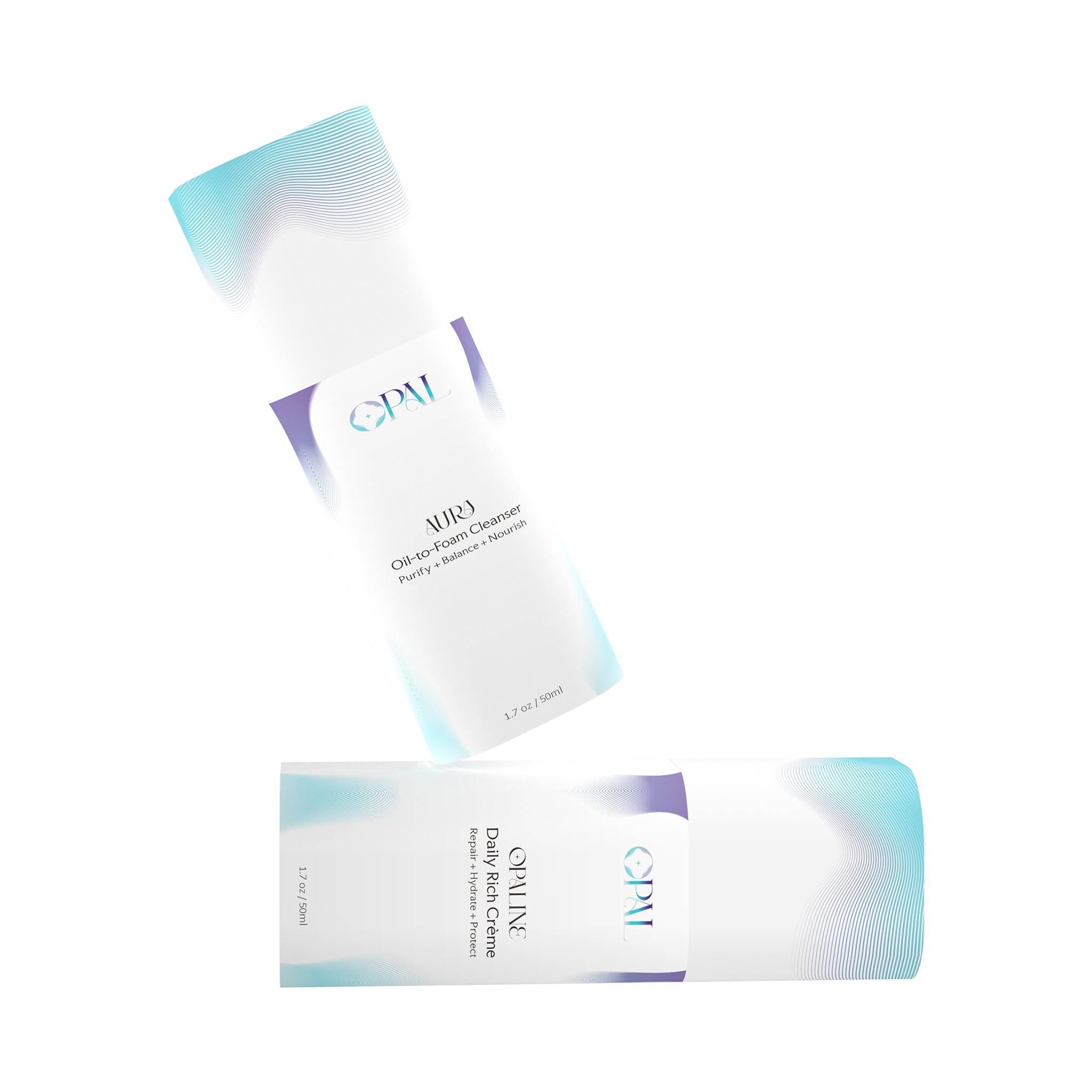 Unlike conventional cleansers that strip your skin and standard moisturizers that only hydrate the surface, our duo works together to protect and strengthen your skin barrier. Aura's macadamia oil infusion allows thorough cleansing without damage, while Opaline's triple-action formula repairs, hydrates, and protects simultaneously. This creates a foundation of healthy skin that other random products can't achieve.